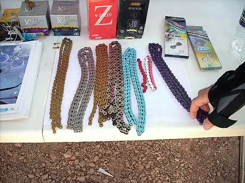 In order to reduce weight, chains have been manufactured with hollow pins and with cut-outs in the links.[24] Chains have also been made of stainless steel for corrosion resistance[25] and titanium for weight reduction, but they are expensive.[26] A recent trend is chains of various colors, and at least one manufacturer offers a chain model specifically for electric bicycles.[27]