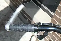In cycling, bar ends are extensions typically fitted to the ends of straight handlebars.[20] They extend away from the handlebars and allow the rider to vary the type of grip and posture that they use during a ride. They are especially effective when climbing out of the saddle, because they increase leverage. Bar ends can also improve comfort for the rider due to the neutral position of the hands (palms inward) which places marginally less stress upon the musculature,[21] and by providing more than one place to rest hands on a long journey.[22]