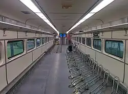 Two MBTA Commuter Rail cars are modified to hold bicycles - one entirely for bicycles, and another with half the space remaining as seating - and a third is planned to modified similarly.[14] On weekends between Memorial Day and Labor Day, one of the cars runs on the Newburyport/Rockport Line and the other on the CapeFLYER service to Cape Cod.[2]