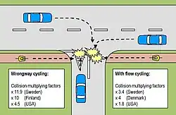 However, the implications for road safety of cycle tracks at intersections is disputed. Studies generally show an increase in collisions at junctions, especially where cyclists are travelling in the direction opposite to the flow of traffic (e.g. on two-way cycle tracks). Protected intersection designs generally improve safety records over non-protected junction types.[1][8]