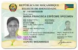 The Bilhete de identidade (English: Identity Card), commonly abbreviated to BI, is the national identity card of Mozambique.