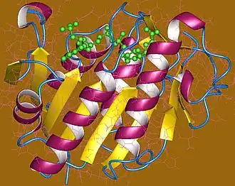 BVR is composed of two closely packed domains, between 247 and 415 amino acids long and containing a Rossmann fold.[4] BVR has also been determined to be a zinc-binding protein with each enzyme protein having one strong-binding zinc atom.[5][6]