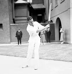 Brown missed selection for the tour opener against Worcestershire—in which Australia traditionally fielded its first-choice XI—before making his debut in the second match against Leicestershire.[5][9] He made a century against Cambridge University in his second tour match, making 105 in the middle order.[18] Batting at number 3 against Lancashire in the final tour match before the Tests, Brown scored 119. After compiling 351 runs at 43.88 in the opening tour matches,[9] he was selected for the Test side.[5] Playing in all five Tests, Brown made his debut at Trent Bridge, Nottingham and scored 22 in his first innings.[9][19] After Australia lost three early wickets in the second innings, Brown scored 73 to help secure a winning lead.[19] Brown then made a century while opening the batting against Northamptonshire,[20] and an unbeaten 62 in the second innings, guiding Australia to an eight-wicket victory over the Gentlemen of England.[9] He was promoted to open in the Second Test at Lord's with Woodfull, after Ponsford was unavailable due to illness.[21] At the home of cricket, Brown made his maiden Test century, scoring 105 in the first innings.[22] His innings was an unhurried one; he tended to wait for the ball to come onto the bat rather than attacking the leather.[3] However, he was unable to prevent Australia from being forced to follow-on and made two; the match ended in an innings defeat.[9] He was retained as opener upon Ponsford's return for the Third Test, with Woodfull dropping down the order in a reshuffled batting line-up. Brown made 72 and a duck.[5] The match ended in a draw after both teams passed 490 in the first innings.[9]