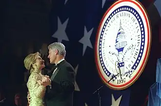 President Bill Clinton dances with First Lady Hillary Clinton during the celebrations of winning re-election. This event was in Washington, D.C., and the theme centered around the Commander-In-Chief.