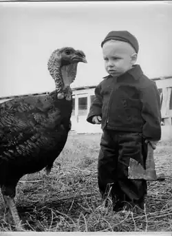 The following year, just after his high school graduation, Ray was hired as a journalist for the Lincoln Journal.[2] In November 1954, less than twelve months after he began work at the paper, a photo of his (shown at right) was distributed as a wirephoto to hundreds of papers across the country.[2] Appearing with the caption "The Great Decision," it showed a toddler holding a hand ax eyeing a turkey. Ray held his camera close to the ground making it appear that the turkey and boy were about the same size.[note 2] The recognition Ray received for taking it helped him obtain a job in the Chicago office of United Press International later that year.[3] In 1958, after a short stint working at the Minneapolis Star and Tribune and subsequently turning down a job offer from National Geographic, Ray moved to New York to begin a freelance work for Life magazine.[3][7] A year later he joined Life as a full-time member of the staff.[3]