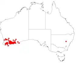 Kurup grows around salt lakes, on river flats and on granite in the Avon Wheatbelt, Coolgardie, Esperance Plains, Jarrah Forest and Mallee bioregions of Western Australia.[2][3]