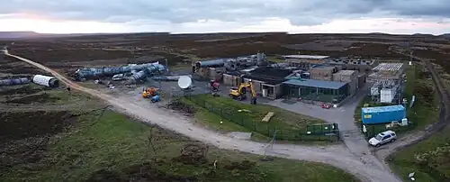 The Bilsdale transmitting station is a broadcasting and telecommunications facility, located at Bilsdale West Moor above Bilsdale, close to Helmsley, North Yorkshire, England. The original facility included a guyed steel tubular mast that was primarily used for radio and television transmission. The height of the mast was 314 metres (1,030 ft) to the pinnacle.[2] Until a fire disabled the transmitter on 10 August 2021 it was among the most powerful transmitters in the UK. The power for analogue was 500 kW ERP and it was 100 kW / 50 kW for digital. The mast was equipped with aircraft warning lights, in the form of arrays of red LEDs. The station was owned and operated by Arqiva.[3] After the main mast was disabled a temporary 80 metres (260 ft) mast was installed at the site. The temporary mast commenced operations on 13 October 2021.[4]