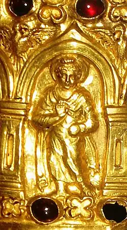 - ^ "Standing Buddha in the arched compartment, flanked by figures of Brahma and Indra standing in similar compartments, detail of the side of Bimaran gold casket".[17]