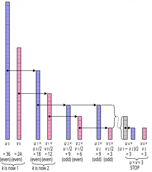 - if this only applies when both numbers are even, the algorithm is similar to the Euclidean algorithm.