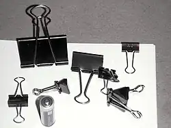 A binder clip (also known as a foldback clip, paper clamp, banker's clip, foldover clip, bobby clip, or clasp) is a simple device for binding sheets of paper together. It leaves the paper intact and can be removed quickly and easily, unlike the staple.