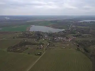 ![]() Aerial view of the Bindersee and the village of Rollsdorf from the northeast; on the right in the background is the "Sweet Lake" | |