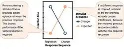 The BRAC framework highlights the sequential dependency of human actions. Corresponding binding and retrieval effects have been observed in a range of experimental setups, including prime-probe experiments[3][4] and sequential choice reaction tasks.[5][6] Key measures in these studies have been reaction times and error rates for speeded responses. These performance measures vary as a joint function of feature sequences for responses and corresponding stimulation: Stimulus repetitions (as compared to stimulus changes) from one occasion to the next facilitate response repetitions rather than response changes. Figure 2 shows an idealized pattern of results as predicted by the BRAC framework.