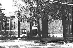 On the interior are six classrooms on each floor, three on each side of the hall. The main floor also contains the principal's office, music teacher's office and rest rooms. In the front there is a combined gymnasium and auditorium located between the entrances; the gymnasium extends up to the second floor. The second floor also has classrooms, restrooms, and library and conference room.[2]
