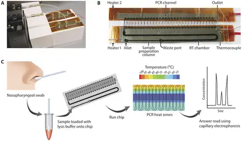 - ^ Wanunu, Meni; Cao, Qingqing; Mahalanabis, Madhumita; Chang, Jessie; Carey, Brendan; Hsieh, Christopher; Stanley, Ahjegannie; Odell, Christine A.; Mitchell, Patricia; Feldman, James; Pollock, Nira R.; Klapperich, Catherine M. (2012). "Microfluidic Chip for Molecular Amplification of Influenza A RNA in Human Respiratory Specimens". PLOS ONE. 7 (3): e33176. Bibcode:2012PLoSO...733176C. doi:10.1371/journal.pone.0033176. ISSN 1932-6203. PMC 3310856. PMID 22457740.