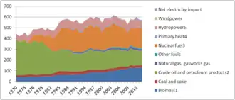 Sweden's energy usage is divided into three sectors: housing and services, industry, and transport and is used in three different ways: to produce heating, electricity and vehicle fuels.[3] In 2014, Sweden used 555 TWh of energy, 130 of which came from biofuels.[4]