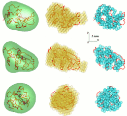 Lysozyme models built by different methods. Left - overall shape reconstructed by SASHA; middle - dummy residue model, built by DAMMIN; DAMMIF; right - chain compatible GASBOR model