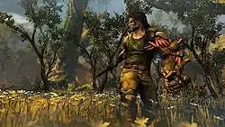 Bionic Commando is an action-adventure game, in which the player controls player character Nathan Spencer. The game uses several mechanics (primarily radiation) which act as barriers. These barriers are used to keep the players within the confines of the linear level design. Nathan Spencer is able to target enemies while hanging, climbing a building or even in mid-swing, while using an implement called the 'Bionic Arm' which can also be used to attack enemies at close range. The bionic arm can be used to grab and launch objects such as boulders and cars at enemies.[3] In addition, he is equipped with boots that enable him to survive extremely long falls. Spencer is equipped with Tungsten gun, which is shot quickly but does minimum damage to the enemies, and Prototype gun, which fires fast and does maximum damage and he can use throwables such as grenades. The weapon reload mechanism is missing in the game and players must try to find the ammunition to use them. Players can also use special weapons such as sniper rifle, machine gun, shotgun, grenade launcher and missile launcher with limited amount of ammo. The ammunition can be found from the dead bodies and other parts of the game as well, with exception of the special weapon ammunitions which can be found rarely. The ammunition can be categorised by its color i.e. orange ammo for primary weapon, blue ammo for grenades and red ammo for special weapons. Spencer can also attack from a greater height by stomping the ground with his Bionic Arm, causing to kill multiple enemies at once, plus he can also hack drones and other systems with the attached arm. However, due to the heavy weight of the Bionic Arm, Spencer can not swim (although he could swim before he lost his arm)[2] and as a result the players must find a way to get him grappled to a safe zone before he drowns.