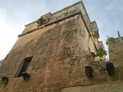 Birkirkara Tower has a square plan, and its roof is surrounded by a high parapet wall. The latter contains six box machicolations;[5] a pair at the left-side and two on the right-side, and one each at the front and back.
