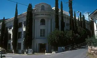 The old Bisbee High School is at 100 Old Douglas Rd, Bisbee, AZ (31°25′48″N 109°53′31″W / 31.4300°N 109.8919°W) Bisbee High School was designed by architect Norman F. Marsh and constructed in 1914. It housed around 450 students a year until closing in the late fifties after the construction of a new high school. The building is three stories and is noted for having a ground-level entrance on each floor. After closing as a high school, the building began to serve as offices for Cochise County, such as the district library, the health department for a time, and for elections, and adult probation services. Today, the building is vacant and waiting to be renovated into an apartment complex.[3][4] During some recent construction, the job supervisor was shot and killed by a disgruntled former employee outside the Old Bisbee High School. It appears the matter is still under investigation.[5]