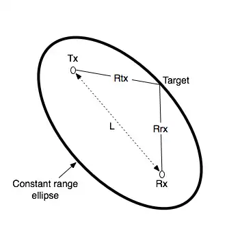 Bistatic range refers to the basic measurement of range made by a radar or sonar system with separated transmitter and receiver. The receiver measures the time difference of arrival of the signal from the transmitter directly, and via reflection from the target. This defines an ellipse of constant bistatic range, called an iso-range contour, on which the target lies, with foci centred on the transmitter and receiver. If the target is at range Rrx from the receiver and range Rtx from the transmitter, and the receiver and transmitter are a distance L apart, then the bistatic range is Rrx+Rtx-L. Motion of the target causes a rate of change of bistatic range, which results in bistatic Doppler shift.[8][9][10]