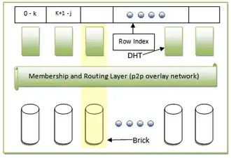 The BitVault architecture is composed of multiple bricks which constitute a logical 160 bit address space, each associated with hash of some data. The association is maintained in a Distributed Hash Table (DHT). The DHT partitions the entire hash table into smaller hash tables. For example, if there are n peers, the hash table would be divided into n hash tables, each starting from the row next to where its immediate predecessor ended. Each DHT has its associated brick, and the extent of the logical address space a brick is responsible for is called its Zone. The bricks communicate using peer-to-peer technology, over the Membership and Routing Layer (MRL). Lookup of any data object can be done by n bricks in parallel, in its own zone, giving an efficiency of O (log N).