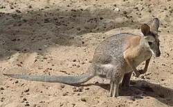 The black-striped wallaby (Notamacropus dorsalis), also known as the scrub wallaby or eastern brush wallaby, is a medium-sized wallaby found in Australia, from Townsville in Queensland to Narrabri in New South Wales. In New South Wales, it is only found west of the Great Dividing Range. It is decreasing in these areas, but is not classified as threatened as a species yet.[3] The New South Wales population, however, is classified as endangered.[4]