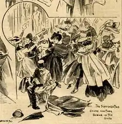 Groups approaching Parliament Square were met at the Westminster Abbey entrance to the square by groups of bystanders, who manhandled the women. As they moved past the men, the suffragettes were met by lines of policemen who, instead of arresting them, subjected them to violence and insults, much of which was sexual in nature. The demonstration continued for six hours; police beat women attempting to enter parliament, then threw them into the crowds of onlookers, where they were subjected to further assaults.[56] Many of the suffragettes considered that the crowds of men who also assaulted them were plain clothes policemen.[57] Caxton Hall was used throughout the day as a medical post for suffragettes injured in the demonstration. Sylvia Pankhurst recorded that "We saw the women go out and return exhausted, with black eyes, bleeding noses, bruises, sprains and dislocations. The cry went round: 'Be careful; they are dragging women down the side streets!' We knew this always meant greater ill-usage."[58] One of those taken down a side street was Rosa May Billinghurst, a disabled suffragette who campaigned from a wheelchair. Police pushed her into a side road, assaulted her and stole the valves from the wheels, leaving her stranded.[59] The historian Harold Smith writes "it appeared to witnesses as well as the victims that the police had intentionally attempted to subject the women to sexual humiliation in a public setting to teach them a lesson".[60]