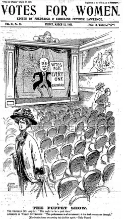 - ^ The first such act was in October 1905. Christabel Pankhurst and Annie Kenney interrupted a political rally in Manchester to ask the pro-women's suffrage Liberal Party politician Sir Edward Grey "Will the Liberal government give votes to women?". The two women were arrested for assault and obstruction; on refusing to pay the fines levied against them, they were sent to prison.[3]