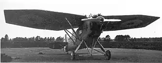 The wooden-sparred thick wing was of low aspect ratio, with a maximum chord section of about 38% of the span. This chord was maintained from about ¼-½ the span with a much narrower centre section to improve vision; the wingtips were very square.[1] The wings, braced with N-type struts to the fuselage, could be folded by rotation around an inclined axis so that they lay chord-vertical alongside the fuselage for storage aboard an aircraft carrier.[1]
