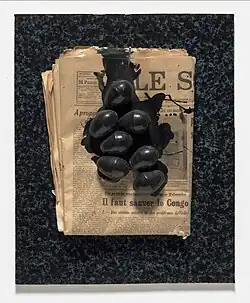 - In late 1963, just before Marcel Broodthaers publicly announced that he was becoming a visual artist, he made an assemblage titled Le Problème noir en Belgique (The Black Problem in Belgium) by nailing a copy of the Belgian newspaper Le Soir to a piece of decorative board and attaching seven white plastic eggs to the paper by coating them in shiny black paint. The eggs, paint, and newspaper are arranged in such a way as to foreground a front-page article with the headline "Il faut sauver le Congo" (We must save the Congo) and the lede "Des vérités simples et des problèmes difficile" (Some simple truths and difficult problems). The work was acquired by the Museum of Modern Art, New York, in 2015, through the generosity of Ronald S. and Jo Carole Lauder, Marlene Hess and James D. Zirin, Marie-Josée and Henry R. Kravis, Catie and Donald Marron, Sue and Edgar Wachenheim III, and the Committee on Drawings and Prints Fund, in honor of Herman J. Daled and Nicole Daled-Verstraeten.[53]