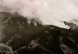 Blackwater Creek originates on the north slope of Sheep Mesa at an altitude of 11,400 feet (3,500 m) in Shoshone National Forest and flows north through Blackwater Canyon. The creek is 12 mi (19 km) long and descends a steep gradient before it empties into the North Fork Shoshone River, across from U.S. Routes 14/16/20 immediately west of Mummy Cave and 15 mi (24 km) east of the border of Yellowstone National Park.[2] The firestorm deaths occurred on the west slopes of Clayton Mountain, approximately 5 mi (8.0 km) south by trail into the canyon.[3][4] The canyon consists of numerous ravines and small ridges, which form a washboard landscape shaped by extensive erosion of the volcanic igneous rock that constitutes the Absaroka Range.[5] The canyon has moderate to steep slopes with a gradient of 20 to 60 percent.[6] The regional flora is an upper montane mixed-conifer forest dominated by Douglas fir trees.[6][7] When the fire swept through the area the forest was dense and mature with heavy fuel loads from dead trees, which also had dead limbs extending to the ground, providing a fuel ladder for fire to easily spread into the tree tops.[6]