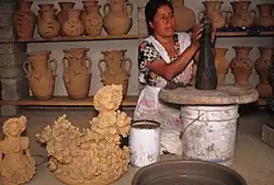 Irma García Blanco is one of Teodora’s daughters, born in Santa María Atzompa in 1959.[3][6] Irma continues her mother’s legacy with her own large, ornate clay figures which are lively and full of detail.[6][7] Irma began working with clay at the age of six, helping her mother by making small figures.[6][8] Although Irma herself only finished the second grade, some of her seven children have gone onto college. Irma’s husband worked in Mexico City as a factory sales person for 27 years, commuting home on the weekends. He retired when the factory closed. Since then, Irma’s work has become the main family income and has received support from her husband.[7]