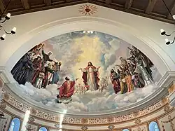 On the east side of the church is a smaller chapel, where the body of Rother rests within the altar.[13] The apse of the chapel features a mural, designed by EverGreene Studios of Brooklyn, N.Y.[13] The mural depicts Rother's arrival into heaven, where he is welcomed by Jesus Christ and a collection of other martyr-saints.[13]