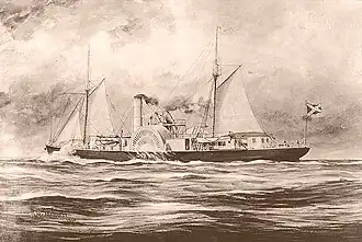 - SS Syren (1863–1865), a privately owned iron-hulled sidewheel steamer, built at Greenwich, Kent, England, in 1863 for a blockade runner. Owned by the Charleston Importing and Exporting Company, she made her first run on November 5, 1863, running supplies from Nassau to Wilmington. The Syren completed a record 33 runs through the blockade, the most of any blockade runner.[60][95] Her career as a blockade runner came to an end when the Syren, along with the other steamers Celt, Deer and Lady Davis, were captured in Charleston harbor at the Ashley River, where she had successfully run in through the blockade the night before, on February 18, 1865.[96]