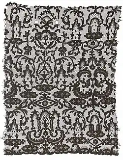 Blonde lace is a continuous bobbin lace from France that is made of silk. The term blonde refers to the natural color of the silk thread.[1] Originally this lace was made with the natural-colored silk, and later in black.[2] It was made in the 18th and 19th centuries.[2] The pattern, which is generally of flowers, is made with a soft silk thread, thicker than the thread used for the ground.[1][3] This causes a big contrast between the flowers and the ground.[3] It uses the same stitches as Chantilly lace and Lille lace,[3] and is similarly made in strips 5 in (13 cm) wide and invisibly joined.[1][3]