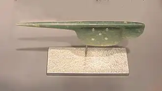 - ^ This particular artifact, from the Snite Museum of Art, is labelled as a bloodletter. This is echoed by Gillett Griffin, who states that the spoon "probably had a ritual function in bloodletting or in the absorption of hallucinogens for ritual purposes" (Griffin, p. 219). There is some disagreement, however, in this identification: Justin Kerr, for example, tentatively identifies similar Maya implements as "symbolic jade versions" of a paint container for a scribe (see "Where Do You Wear Your Paint-Pot?".