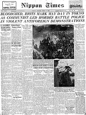 Bloody May Day (血のメーデー事件, Chi no mēdē jiken) refers to a violent conflict that took place between protesters and police officers in the Kokyo Gaien National Garden in front of the Imperial Palace in Tokyo, Japan, on May 1, 1952. When a large crowd protesting the U.S.—Japan Security Treaty refused to disband, a bloody melee took place between protesters and police officers. Eventually the police officers opened fire on the crowd, killing 2 and injuring 22 with bullet wounds.[1] Altogether, around 2,300 people (1,500 protesters and 800 police officers) were injured in the fighting.[2]