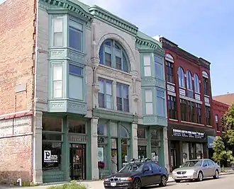 The Bloomington Central Business District is a historic district in downtown Bloomington, Illinois. The district includes roughly twelve square blocks of the city and encompasses 140 buildings, 118 of which are contributing buildings to the district's historic character.[2] The 1901 McLean County Courthouse, the center of government of McLean County, is the focal point of the district. The other buildings in the district were built between 1842 and 1942 and are primarily commercial. The Miller-Davis Law Buildings, two of the oldest buildings in the district, were built in 1843 and represent the early period of Bloomington's development. Bloomington's commercial core grew rapidly during the 1850s and 1860s after two railroads opened in the city; while the 1854 Gridley Bank is the only surviving pre-1857 building from this period, several more remain from the later part of the boom. The city continued to grow, and its business district continued to expand, from 1860 until 1900; however, a fire destroyed much of its downtown in 1900. Several buildings in the district date from the rebuilding period of the early 1900s.[3]