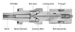 Roller-delayed blowback was first used in Mauser's Gerät 06H prototype. Roller-delayed blowback operation differs from roller-locked recoil operation as seen in the MG 42 and gas operated roller locked, as seen in the Gerät 03 and Gerät 06.[26] Unlike the MG 42, in roller-delayed blowback the barrel is fixed and does not recoil, and unlike the Gerät 03 and Gerät 06 and StG 44, roller-delayed blowback systems lack a gas piston. These omissions are conducive to relatively light construction by significantly reducing the number of parts required and the amount of machining required to produce a rifle. As the bolt head is driven rearward, rollers on the sides of the bolt are driven inward against a tapered bolt carrier extension. This forces the bolt carrier rearward at a much greater velocity and delays movement of the bolt head. The primary advantage of roller-delayed blowback is the simplicity of the design compared to gas or recoil operation.[27]