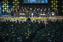 On March 13, 1996, renovations to expand the arena took place, eliminating the permanent stage at the south end of the building. On July 24, 1998, Blue Cross Blue Shield and City officials announced that the name of the renovated arena would be Blue Cross Arena at the War Memorial. On September 18, 1998, the arena reopened to the public during a formal ribbon cutting/rededication ceremony. DeWolff Partnership Architects completed the project as Architects of Record with Rossetti Architects in a consultant relationship. C.E. DeWolff, Senior Partner of DeWolff Partnership, Geno Rossetti of Rossetti Architects, were Design Associates who collaborated on features of the design.[8][9] In 2018, the city terminated the arena management contract with long term operator SMG who had been running the arena since 2000. In July 2018, the city reached an agreement with Pegula Sports and Entertainment, owners of the Americans, Buffalo Sabres and Buffalo Bills and operators of KeyBank Center in Buffalo to operate the arena beginning on August 1, 2018.[10] Shortly after the Pegula takeover the arena received updates of a new center scoreboard, a new ribbon board at the stage end of the arena and enhancements to the audio and video equipment. There are plans for expansion along the Exchange Boulevard side of the arena that will make room for additional office space and improved locker room facilities as well as planned upgrades to the bathrooms, new concessions and a restaurant.[11] Pegula has been criticized for monopolizing the arena for its own teams and disallowing other tenants to play there, which became an even greater problem when alternative arenas such as The Dome Center[12] and the Main Street Armory[13] closed to tenants in 2023; the Rochester Lancers indoor soccer team was forced to fold in part because Pegula refused to rent the arena to them and no other arenas were available.[14]