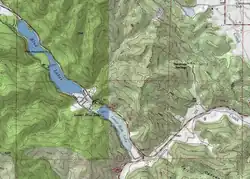 2. ^ A Google terrain map of the region shows State Route 20 runs southwest from Saratoga Springs on the edge of the Clear Lake valley, then turns northwest to run past the Blue Lakes at an elevation of 1,358 feet (414 m) and through the valley that holds Cold Creek in its northwest end. The highway then turns southwest down the Coyote Valley to Lake Mendocino at an elevation of 737.5 feet (224.8 m), which drains into Russian River.[15] The Blue Lakes would have drained along the valley that holds this section of State Route 20 before it was blocked.