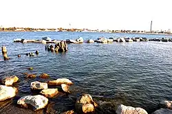 Perhaps the most striking different aspect of the new St. Clair River shoreline along the Blue Water River Walk is the huge stone and boulder structures sticking up from the water just offshore. These huge offshore reefs extend down almost 15 feet into the river bottom. The large boulders seen on the surface weigh as much as 4,000 pounds. They are resting on two other layers; recycled slabs of cement on the very bottom and a middle layer of smaller boulders. All together, over 8,000 tons of rock, stone, cement and boulders were used to build these reefs.[1]