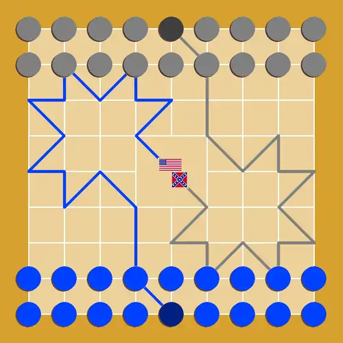 Blue and Gray is a strategy board game for two players invented by Henry Busch and Arthur Jaeger in 1903.[1] They obtained a patent for the game, but may never have published it. The name Blue and Gray "refers to the uniforms of the South and the North in the Civil War and in the original game the playing pieces of the contestants were of those colors."[1] Blue and Gray is a variant of checkers.[a]