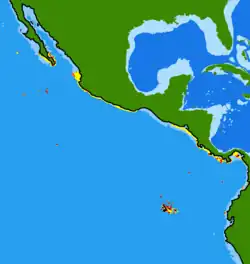 The blue and gold snapper is found in the eastern Pacific Ocean where it has a rather discontinuous distribution. It occurs at the mouth of the Gulf of California and southern Baja California, and along the western coast of Mexico, from southern Guatemala to Panama and Colombia. It also occurs at the Revillagigedo Islands of Mexico, Clipperton Island, Cocos Island of Costa Rica, Malpelo Island of Columbia and the Galápagos Islands in Ecuador.[1] It is found where there are rocky substrates and coral reefs at depths down to at least 55 m (180 ft).[5]