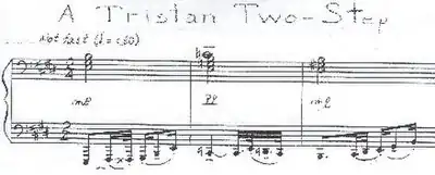 Boury dedicated this movement to his colleague, Kurt Carpenter during their graduate study at the University of Michigan, and was premiered by the composer himself. The musical form is through-composed and divided into three sections: A mm. 1–33, B mm. 34–38, C mm. 39–52. Boury was influenced by the Tristan and Isolde, a story of romance and tragedy. As we know from the title of this movement, it is the style of two-step.[3] Although the 6/8 meter is commonly used for the two-step dance, Boury chose 2/4. “Compound time is just too messy for this piece. With all the development that happens, a pianist would get lost in the middle of the bar”~R. Boury.[4]