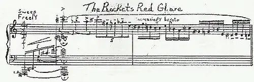 Boury named this piece after the opening gesture of the American Manheim Rocket theme of the finale of Symphony No. 40 in G minor by W. A. Mozart. Although this piece was written for solo piano, there is a full orchestral quality. Like the old composers of the Mannheim school Boury used sudden crescendo in the introduction and rising arpeggiated melodic line accompanied by ostinato. Use of a wide range of keys with chromatic passages and various hairpin dynamic indications support the orchestral quality as well.