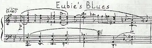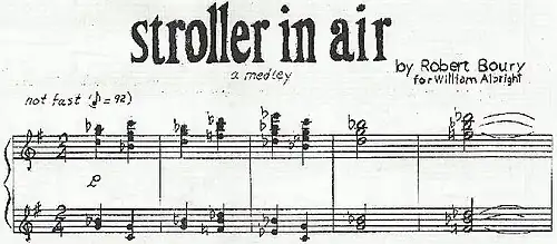 Blues, Rags and Stomps, Op. 1, was composed by Robert Boury between 1970-1973. It consists two books, three movements each. Boury composed mostly during his graduate study at the University of Michigan in Ann Arbor. The first set was nicknamed “Varsity Rags”, which Eubie Blake admired and told the audience, “Now that’s ragtime”, after he heard Boury’s performance at the 1971 Toronto ragtime Festival.[1] Book I and II consist of three movements each: I. A Tristan Two-Step, II. Alice Walking, and III. The Rocket’s Red Glare. Book II: I. Eubie’s Blues, II. Stroller in Air, III. I Left My Heart. Boury comments that “A Tristan Two-step” represents his breakaway from modern music and was a way to be accepted as a tonal composer.[2]