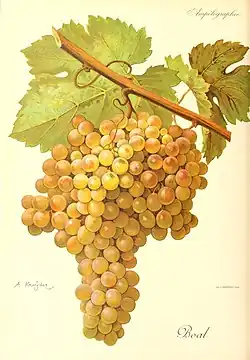 Boal is a name given to several varieties of grape cultivated in Portugal, notably in the production of medium-rich fortified wines from Madeira Island. On many wine labels of Madeira wine, the variety's name is anglicized as Bual. Bual from Madeira is typically less sweet than that from Malmsey, but more sweet than Sercial or Verdelho.[1] The vines are also common in Portugal and Spain, where the fruit is used in the same way for fortified wines.