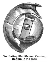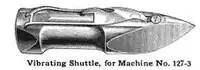 Vibrating shuttle machines reciprocate their shuttle through a short arc. The earliest vibrating shuttles used boat-shaped shuttles, but bullet-shaped shuttles soon replaced them. The design was popularized in the White Sewing Machine Company's 'White Sewing Machine' and Singer's 27-series machines.[5] Now obsolete.[6] | ![]() |