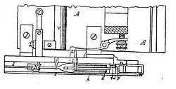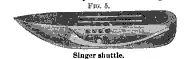 Transverse shuttles carry the bobbin in a boat-shaped shuttle, and reciprocate the shuttle along a straight horizontal shaft. The design was popularized in Singer's 'New Family' machine.[2] The design became obsolete once the other bobbin driver designs were developed.[3] | ![]() |